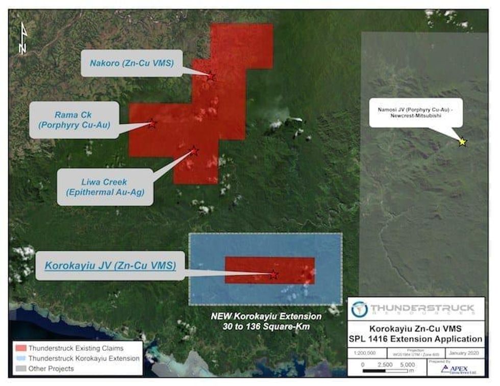 The Korokayiu tenement features approximately 15 kilometres of prospective geologic strike length, including eight additional, underexplored zinc-copper VMS prospects (see Thunderstruck News Release August 19, 2019). The results of 2019 geologic mapping and prospect assessment indicate that the geologic horizon and volcanic stratigraphy hosting the Korokayiu VMS mineralization and other high-priority prospects may extend outside the current landholdings. VMS deposits worldwide commonly occur in clusters within districts, with one or two large deposits and many smaller deposits/prospects.1 The move to expand the Korokayiu landholdings will allow the JV to capitalize on the potential for additional VMS discoveries.