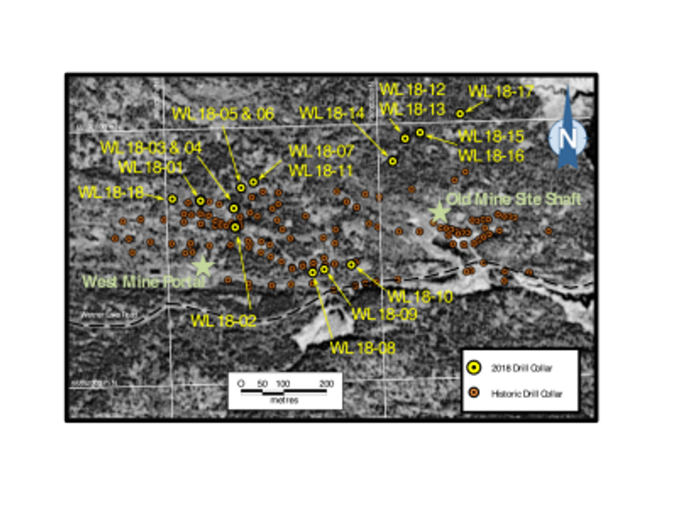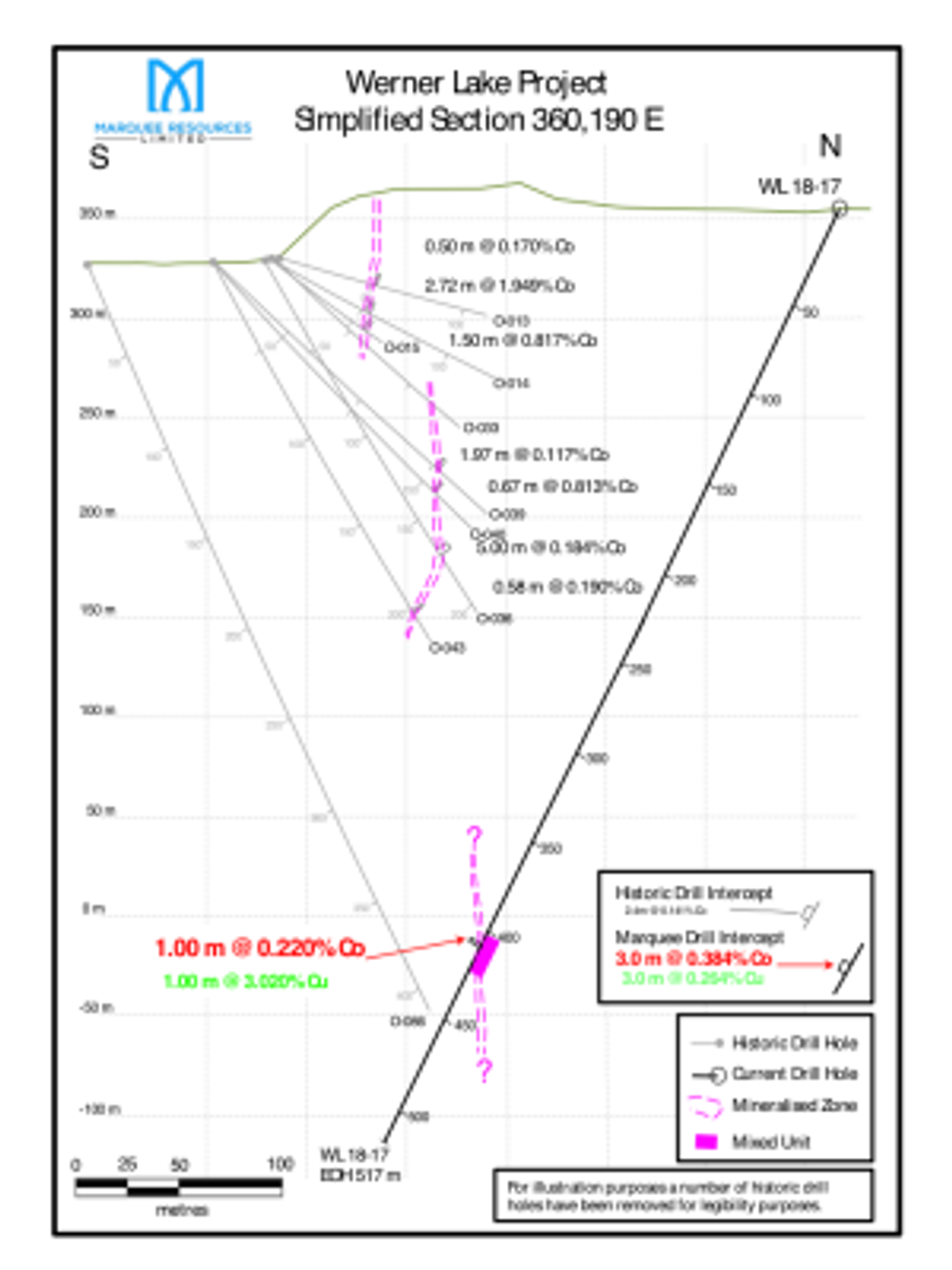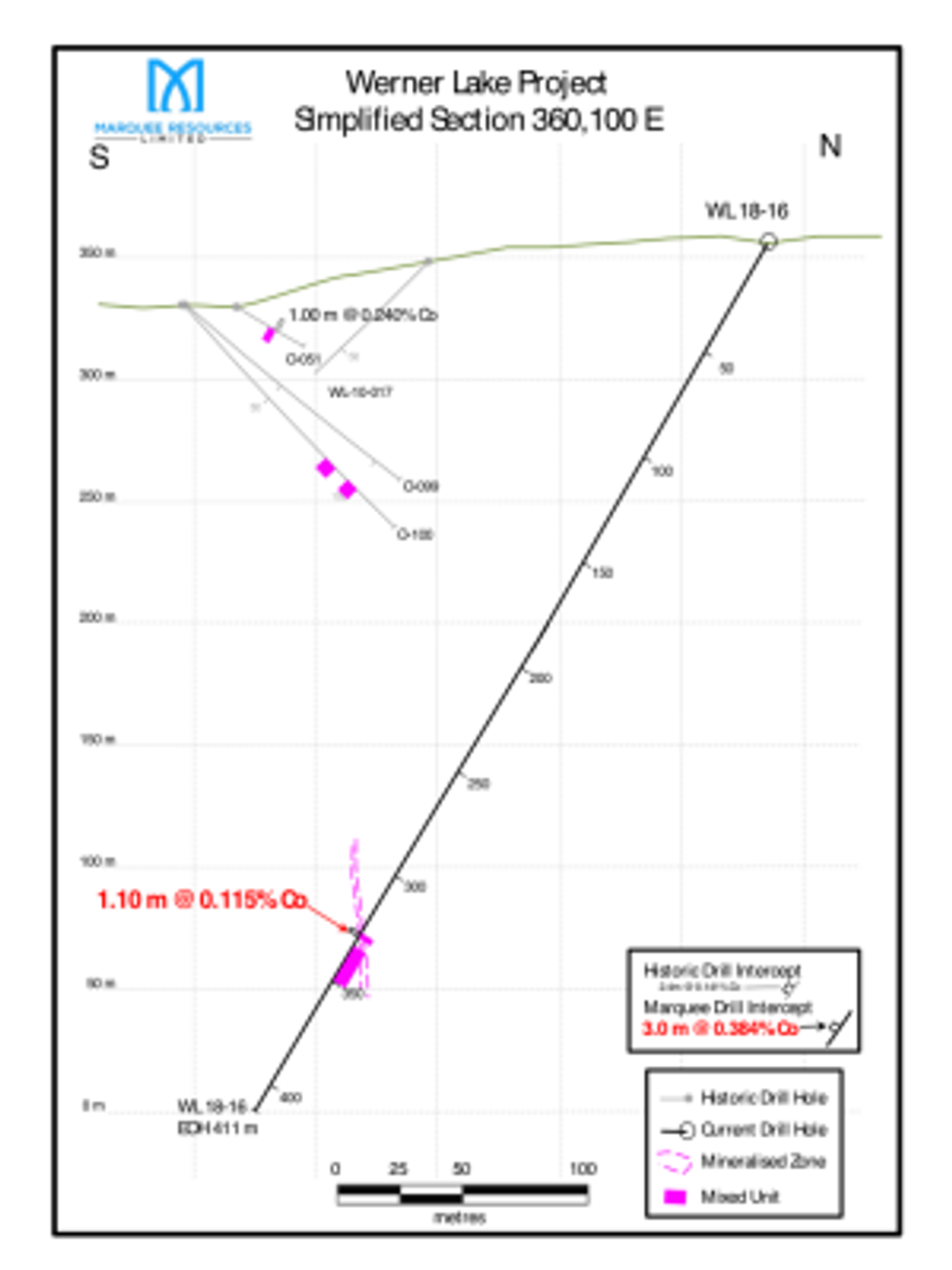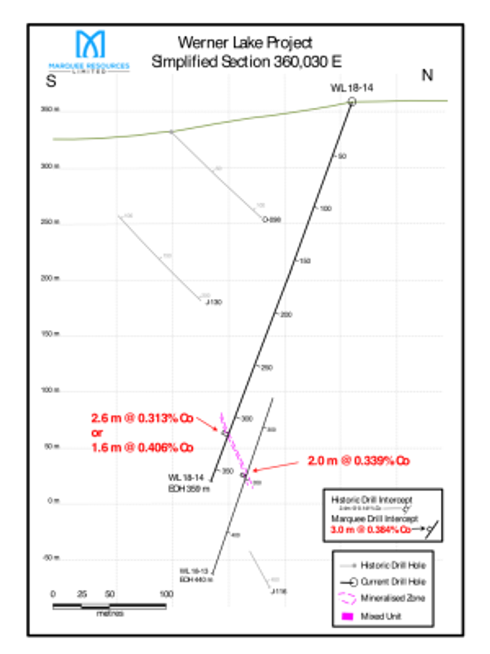 WL 18-17, drilled on section 360,190 E (Figure 3) again tested the down plunge mineralisation associated with the West Cobalt Zone and represents step outs of 150 m from WL 18-16 and approximately 120 m from WL 18-13. The drill hole successfully cut several zones of the Mixed Unit with narrow zones with up to 10-15% combined sulphides. This results indicates the target horizon(s) continue to depth. The hole was also the deepest drilled to date during the current drill program. The positioning of WL 18-17 suggests the hole also hit very close to the Old Mine Zone, a more vertical mineralised shoot (Canmine drill hole O-071; 1.00 m @ 0.160 m from 378.7 m down hole). Following trends of both zones down dip and down plunge sets up a potentially interesting structural intersection at depth.