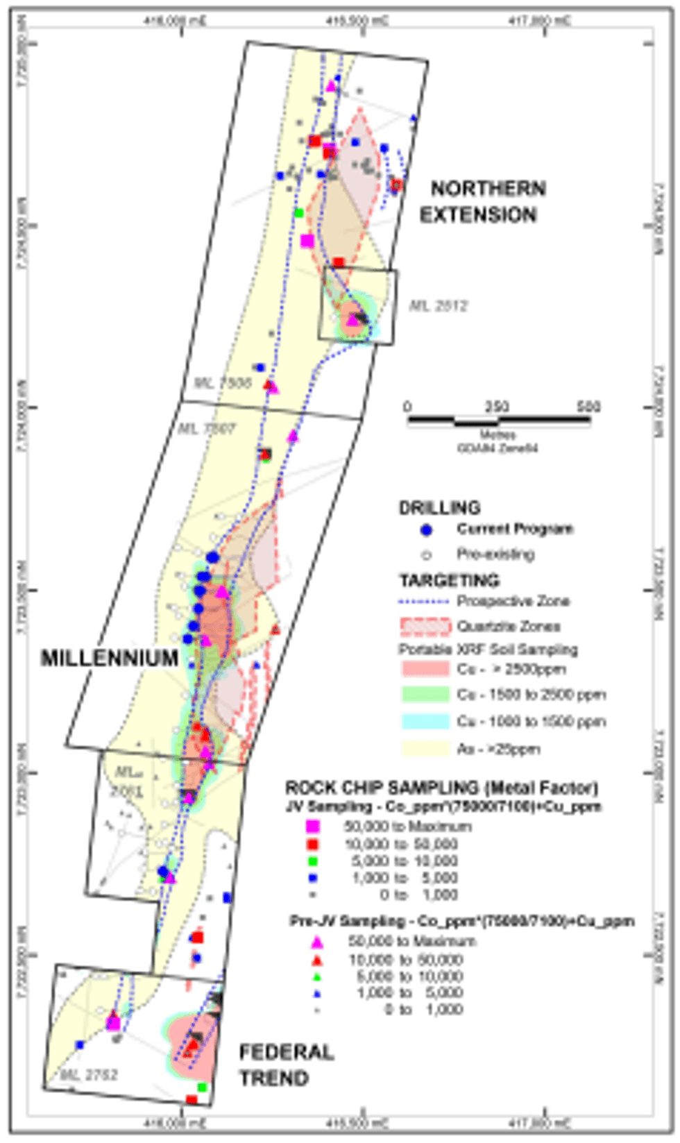 Rock chip sampling has been conducted to test for additional zones of cobalt and copper mineralization along the Millennium trend and in particular the northern strike extension (“Northern Extension”) where similar host rock units and strong soil geochemical anomalies are located. This zone is located approximately 1 kilometre north of the current Millennium resource as defined.