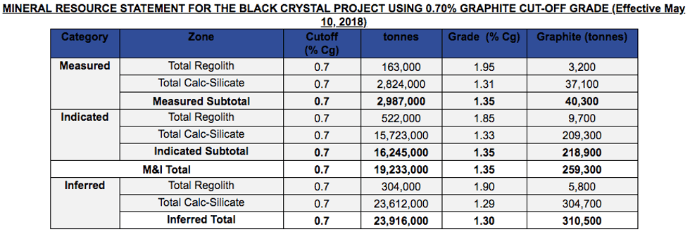 2Mineral resources are classified as Measured, Indicated and Inferred resources and are effective as of May 10, 2018. Measured and Indicated mineral resources do not have demonstrated economic viability. Inferred mineral resources have a greater amount of uncertainty as to their existence and potential economic and legal feasibility, do not have demonstrated economic viability, and are exclusive of mineral reserves. No mineral reserves have been established for Black Crystal. Given the continuity of the mineralization present at Black Crystal, it is the QP’s opinion that most of the Inferred category has the potential to be upgraded to indicated resources upon additional exploration.