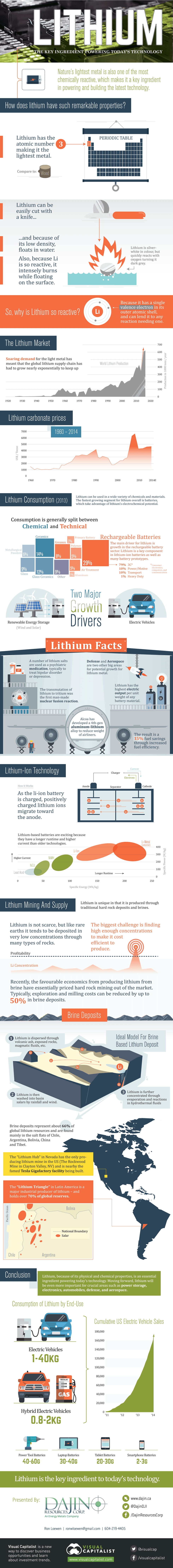 Visual Capitalist published an infographic that looks at lithium and its uses in modern technology. The graphic takes a look at the metal’s properties as well as the types of deposits where lithium is typically found.