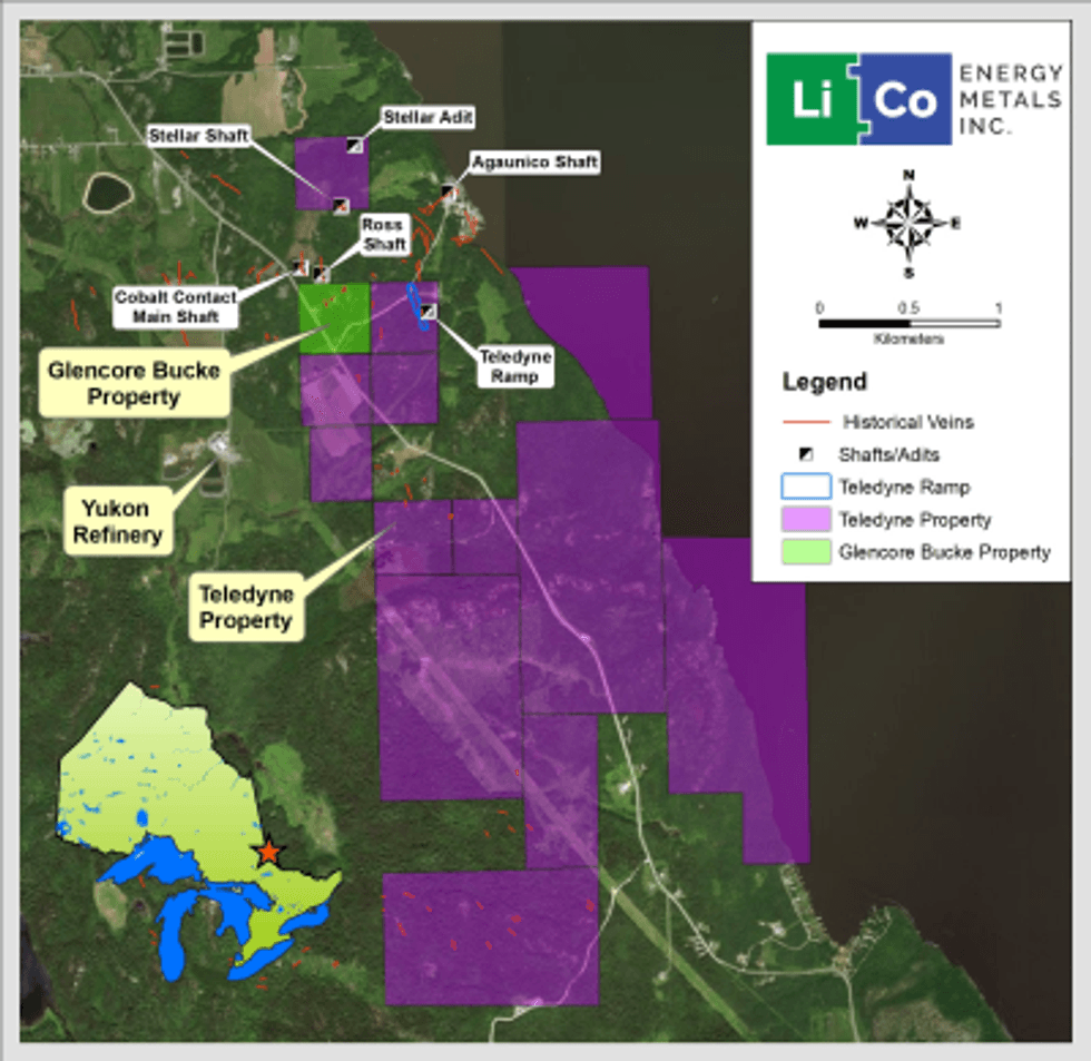 Glencore Bucke Cobalt Project, Cobalt, Ontario: The Company has entered into a property purchase agreement to acquire a 100% interest from Glencore Canada Corporation (subsidiary of Glencore plc) in the Glencore Bucke Property, situated in Bucke Township, 6 km east-northeast of Cobalt, Ontario, subject to a back-in provision, production royalty and off-take agreement. Strategically, the Glencore Bucke Property consists of 16.2 hectares and sits along the west boundary of LiCo’s Teledyne Cobalt Project. The Property covers the southern extension of the #3 vein that was historically mined on the neighbouring Cobalt Contact Property located to the north of the Glencore Bucke Property. Diamond drilling in 1981 on the Glencore Bucke Property delineated two zones of mineralization measuring 150 m and 70 m in length.