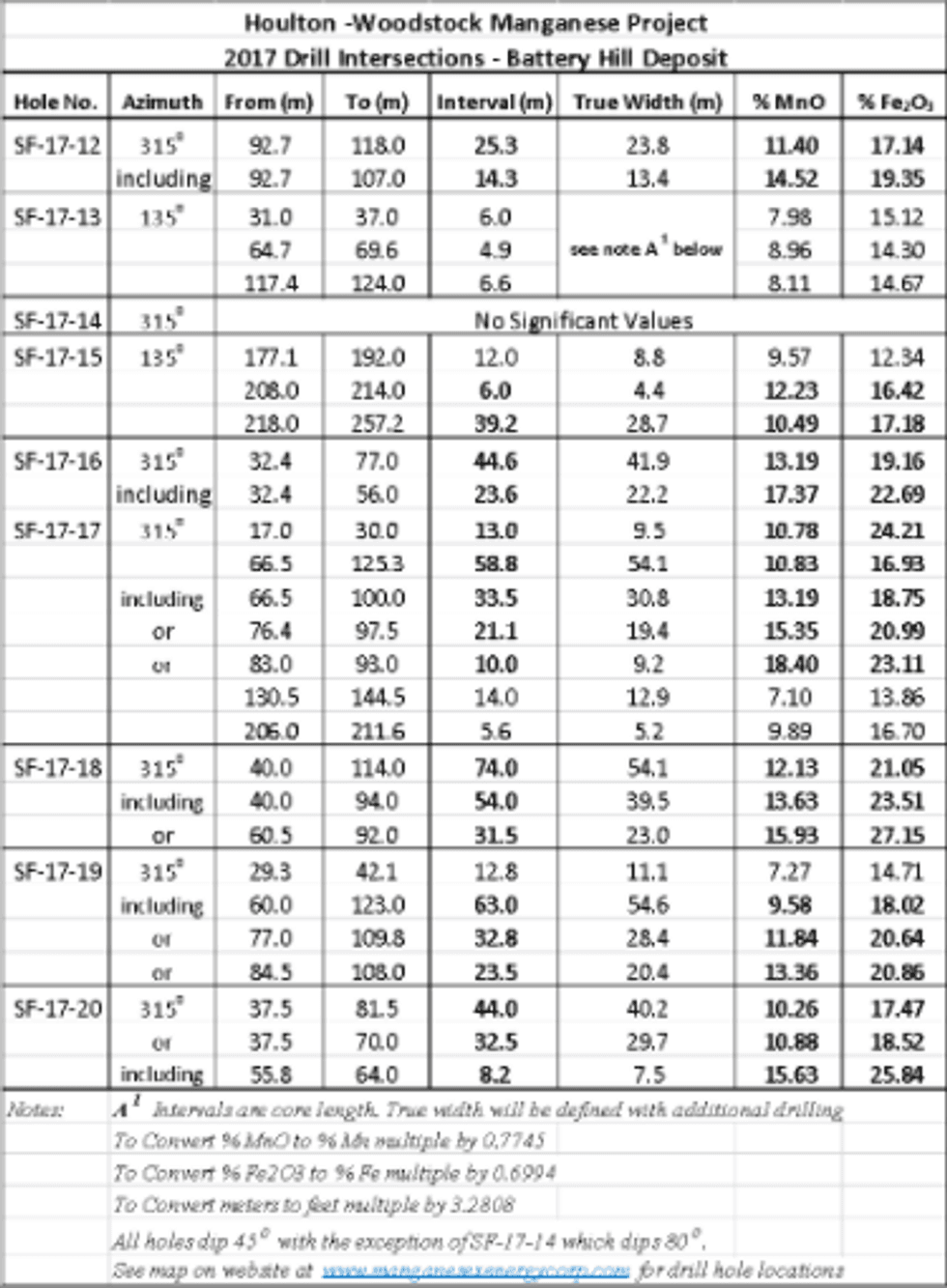The Houlton Woodstock manganese property contains historic workings referred to as (from north to south) the Iron Ore Hill, Sharpe Farm and Moody Hill Mn-Fe occurrences. Historical, non-NI-43-101, tonnage and grade calculations for these occurrences are reported as 22,680,000 tons of 10% Mn, 7,257,000 tons of 9% Mn and 9,071,847 tons at 9.5% Mn respectively. The above estimates are from Sidwell, 1957 using limited drilling and a widely spaced gravity survey. The Company has not done enough work to verify these resources, therefore the above resources are historical in nature and the Company does not treat the historical estimates as current mineral resources / reserves as defined under NI 43-101. Such figures are quoted historical values are not compliant with CIMM or equivalent guidelines and are not to be relied upon. For further information, please refer to our NI 43-101 Technical Report on our website www.manganesexenergycorp.com or refer to our previous press release dated November 30, 2016.
