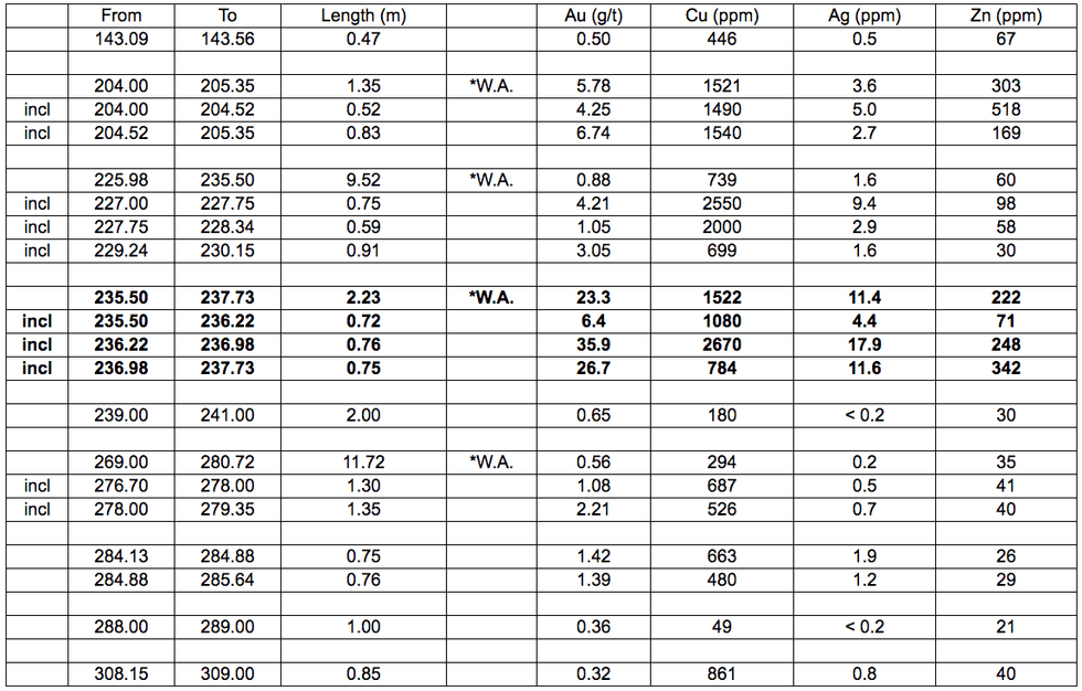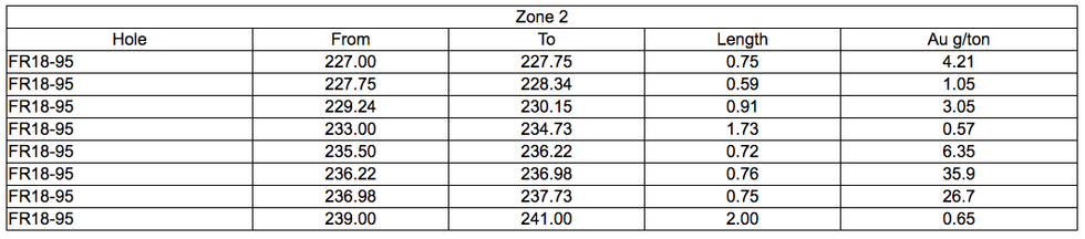 Table 1. Fran Zone 2 Hole FR18-5 Assay Results