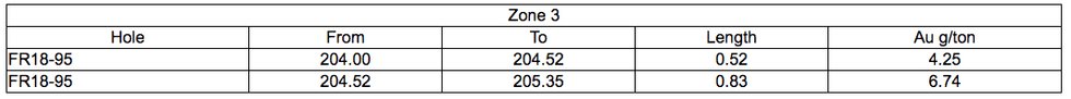 FR18-95 was collared and oriented perpendicular to strike of previously tested steeply-dipping mineralized structures. The hole location is situated in between historic drill holes 75 and 81/62, and successfully intercepted the 50-70 meter down-dip extensions of mineralized Zone 3, Zone 2, and Zone 1.