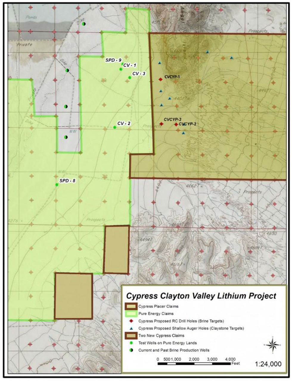 Cypress is also in the process of completing a financing of a private placement of shares at this time. The terms of the private placement are a 12 cent share with a one year 15 cent warrant attached (see News Release June 3rd). Cypress will use the funds raised to auger drill and RC drill the identified lithium rich claystones discovered in 2016 at surface and to explore for the underlying lithium brines at its Clayton Valley Project in Nevada.