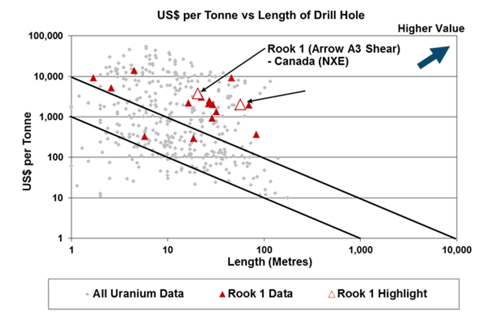 NexGen Energy released assays from the Arrow target at its Rook 1 project. The project is located in the Athabasca Basin 2.1 kilometers north of Fission Uranium’s Patterson Lake South project.