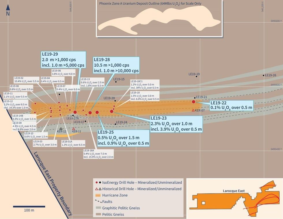IsoEnergy Ltd. (“IsoEnergy” or the “Company”) (TSXV:ISO, OTCQX:ISENF) is pleased to provide an update on its recently completed summer drilling program on the Hurricane zone at the Larocque East property. Highlights include assay results from drill hole LE19-18C1, intersections of strong radioactivity in LE19-28 and LE19-29, plus the intersection of mineralization on an aggressive 250m step-out to the east.