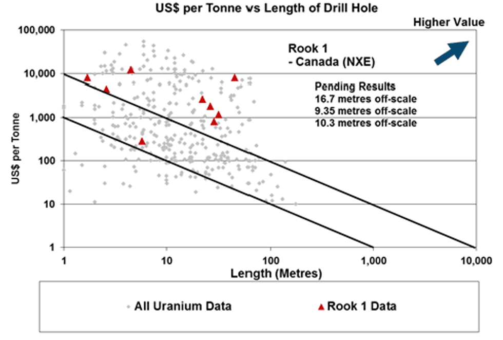 Current drilling pending assays: 16.7 meters of off-scale radioactivity within 89.15 composite; 9.25 meters of off-scale radioactivity within 76.0 composite; 10.3 meters of off-scale radioactivity within 129 composite