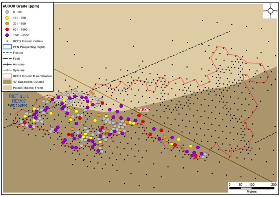 - High grade near surface intercepts from radiometric re-logging of UCEX drill holes in new southern block of Rietkuil project area