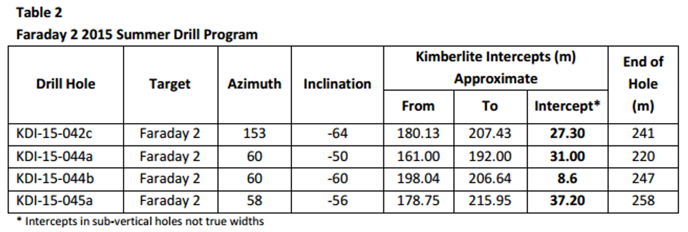 We are also very pleased with the progress of the exploration/delineation drilling at the Faraday 2 kimberlite, which has now extended the strike of the Faraday 2 pipe to approximately 240 meters. The intercepts detailed in Table 2 below targeted the lower areas of the Faraday 2 pipe resulting in shorter intersections than previously reported.