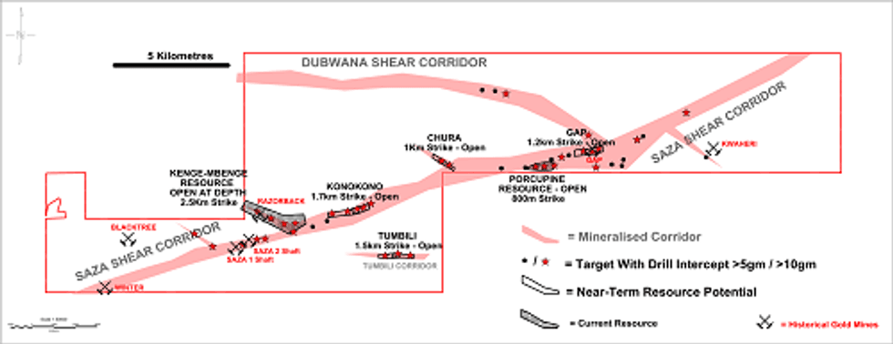 The SMP project lies along the 35-km-long Saza Shear zone and to-date Helio has discovered 30 known mineralized targets. Its current resource is defined within 4 of these 30 targets, namely Porcupine, Kenge, Konokono and Tumbili. All remain open for expansion. Refer to Figure 1.