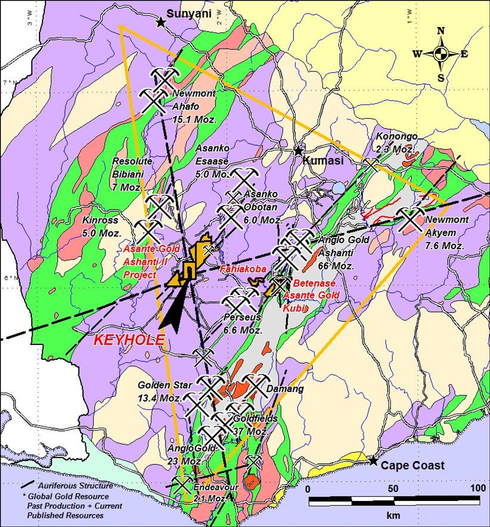 The Keyhole area is surrounded by Asante’s Ashanti II Gold project, and is strategically located at the intersection of three major regional gold mineralized trends: