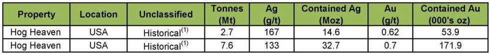 A historic silver and gold resource estimate exists for the Hog Heaven Project: