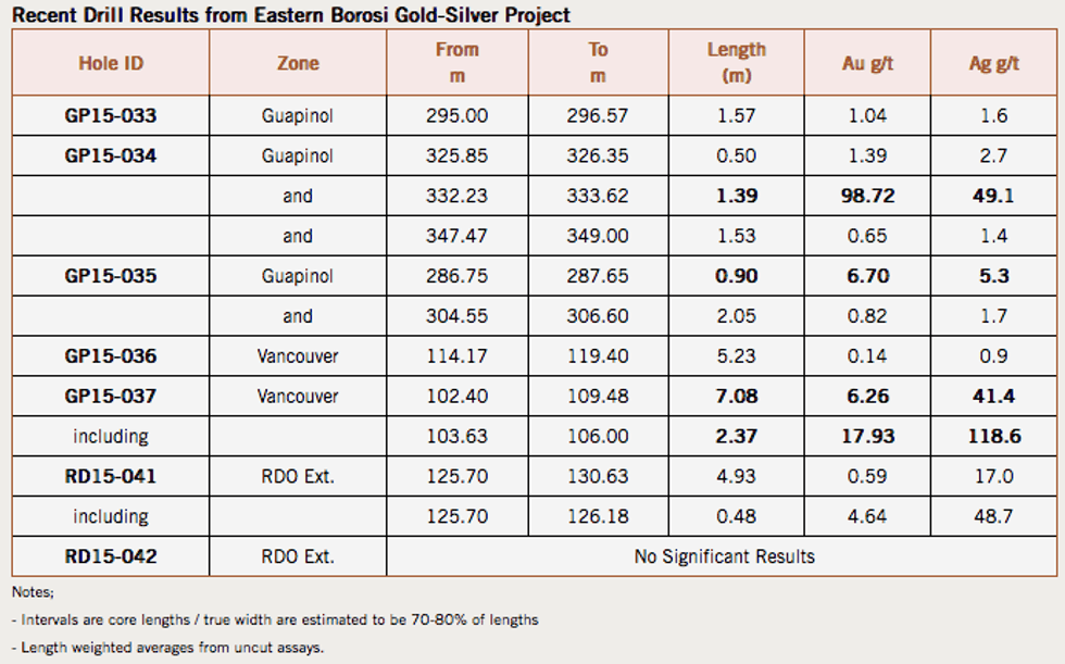 - Diamond drilling on the Guapinol gold-silver vein system has further extended to depth the high grade gold and silver mineralization including: 1.39 metres grading 98.72 g/t gold and 49.1 g/t silver (GP15-034) on the Guapinol Vein and 7.08 metres grading 6.26 g/t gold and 41.4 g/t silver (GP15-037) on the Vancouver Vein.