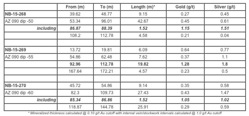 The new NW Sierra Blanca Zone is covered by a thin (<20m) veneer of post-mineral, volcanic rocks and gravels. The zone appears to be dominated by two structural zones, the north-south NWSB zone and the NE trending Rhyolite Zone. The intersection of these two major structural zones was hit in hole NB-15-269 that returned a broad intercept of +1 g/t with stockwork mineralization at less than 100 metres vertically in the system (similar to upper levels of the YellowJacket system).