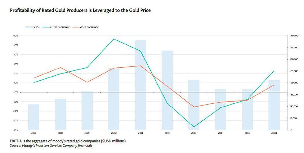 While the industry is generating significantly stronger cash flow, a trend that Moody’s expects to continue next year, higher gold prices alone will not result in ratings upgrades.