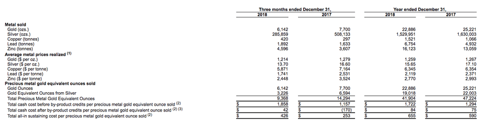 For the year ended December 31, 2018, the Company sold 41,904 precious metal gold equivalent ounces at a total cash cost of $84 per gold equivalent ounce. Realized 2018 average sales prices were $1,259 per ounce for gold and $15.65 per ounce for silver. The Company recorded revenues of $115.3 million, and net income of $9.3 million, or $0.16 per share. Base metal production generated $68.6 million in revenue for 2018.