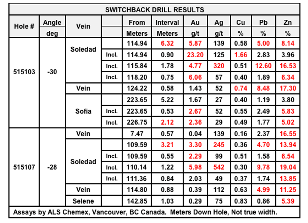 Hole 515107 intercepted four parallel veins, including the Soledad vein which returned 3.21 meters grading 3.30 g/t gold, 245 g/t silver, 0.36% copper, 4.70% lead and 13.94% zinc; including 1.22 meters grading 5.98 g/t gold, 542 g/t silver, 0.30% copper, 9.78% lead and 19.04% zinc.