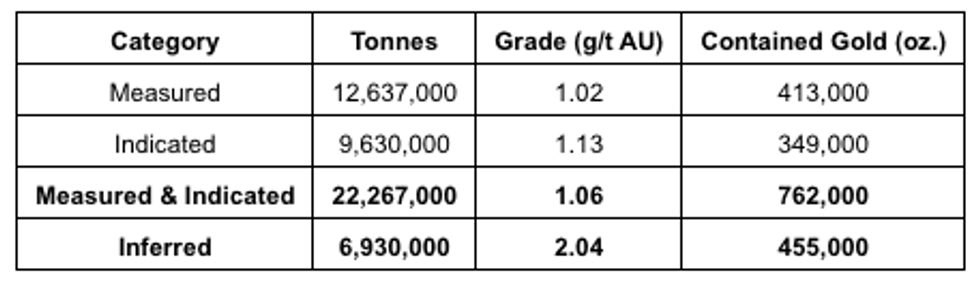 + Pit constrained mineral resources are reported at a cut-off grade of 0.4 g/t Au within a conceptual pit shell. Cut-off grades are based on a gold price of US$1,300 per ounce, a foreign exchange rate of US$0.76, and a gold recovery of 95%.