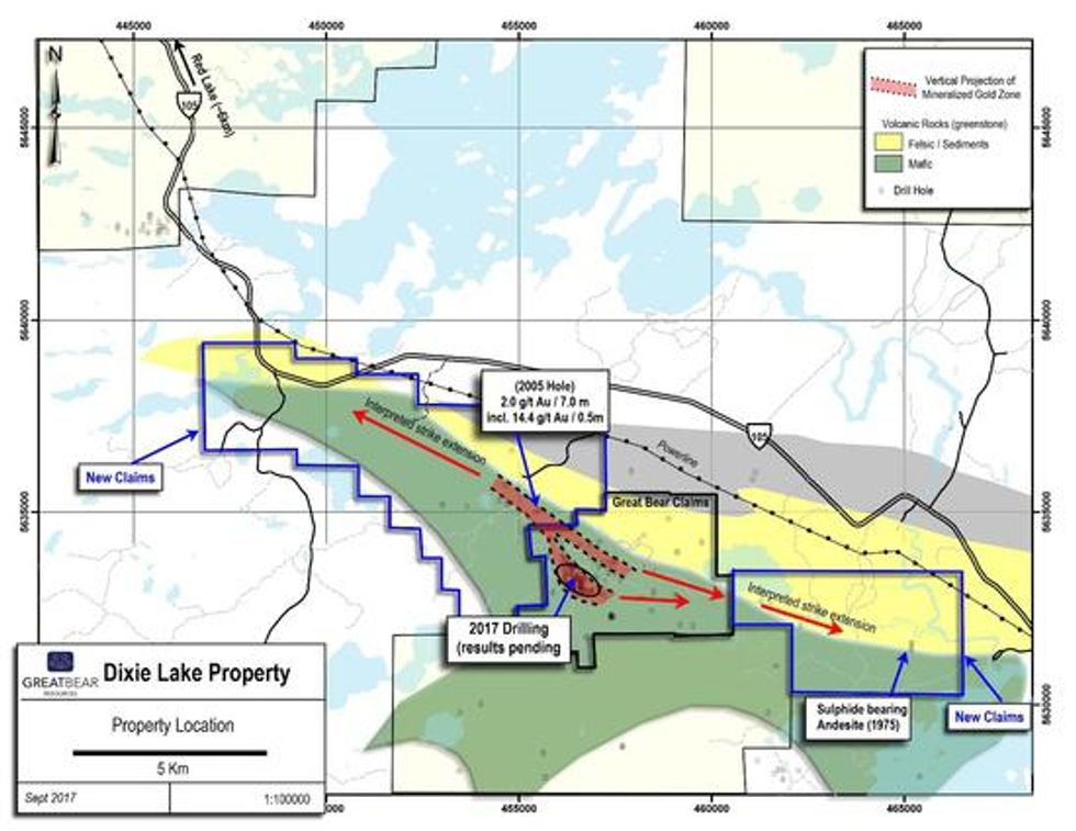 The new claims cover interpreted strike extensions of regional structures and favorable stratigraphy similar to those identified at the Dixie Lake gold zone. Geological interpretation of recent drilling completed by Great Bear Resources, combined with re-logging of historical drill core, identified key structural controls to the gold mineralization. Historical work at Dixie Lake also identified multiple parallel structures / gold bearing zones. These zones can be traced through regional geophysics and geological mapping into the newly staked areas.