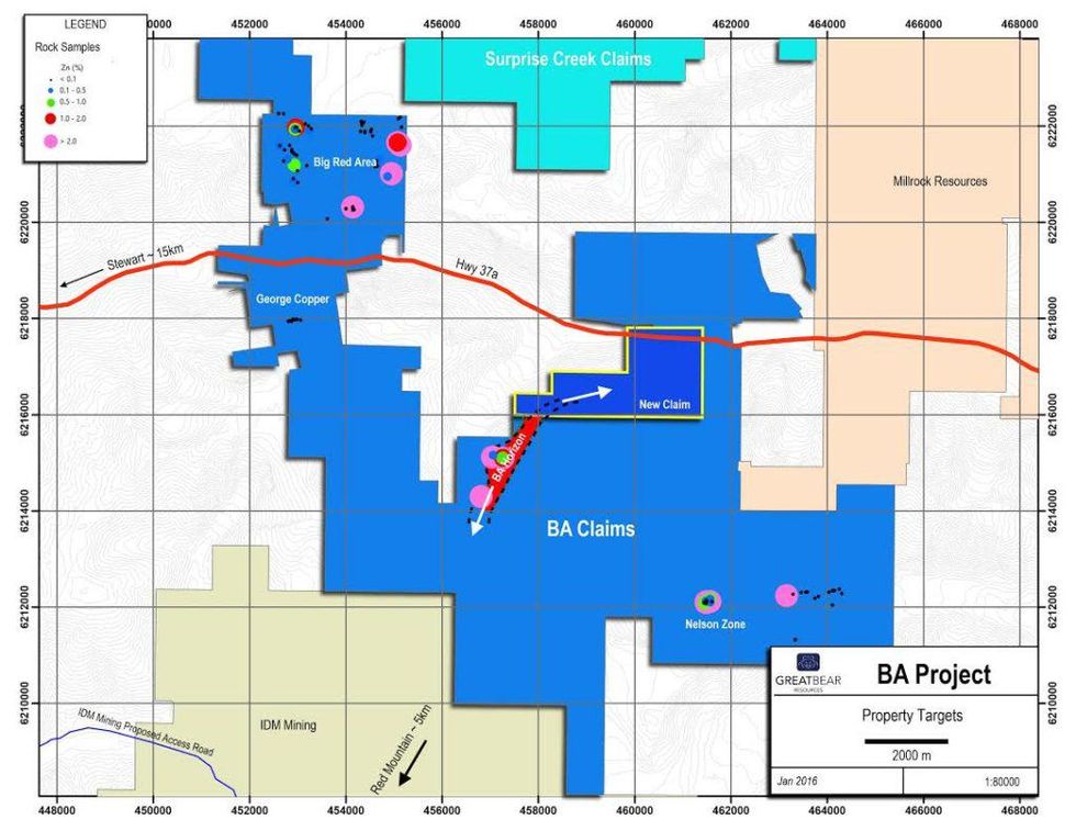 January 17, 2017 – Vancouver, BC, Canada. – Great Bear Resources (TSXV:GBR) today announced that it has identified high grade polymetallic mineralization to be targeted in 2017, and has expanded its 50% owned BA property through staking of an additional 469 hectares. The project now spans 25 claims totalling 10,247 hectares and includes strategic ground between the BA zone and highway 37A that is prospective for hosting extensions to mineralization.