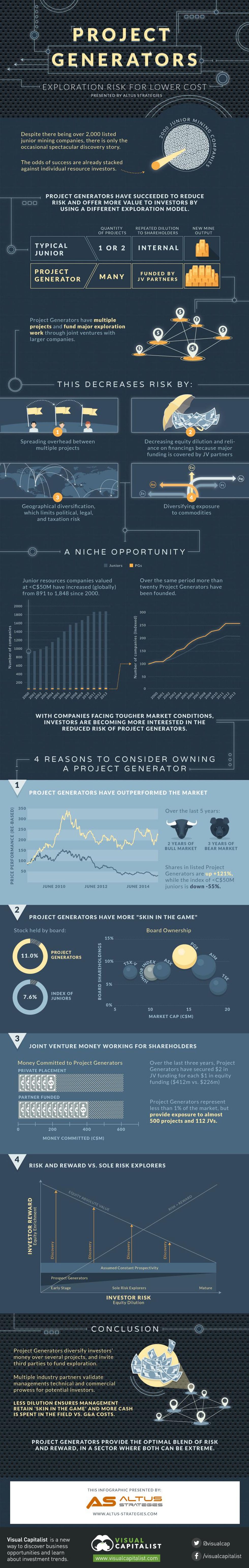 The latest infographic from Visual Capitalist looks at how the project generator model reduces risk while still allowing exposure to exploration for investors.