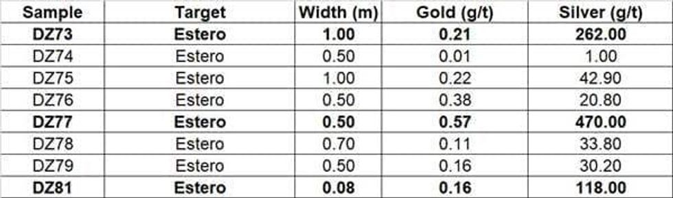 A total of 8 rock samples were taken at Estero and returned consistently anomalous gold values between 0.11g/t gold and 0.57 g/t gold. Three samples returned high-grade silver values from 118 g/t silver to 470 g/t silver, with another four samples returning highly anomalous grades from 20 g/t silver to 43 g/t silver (Table 1).