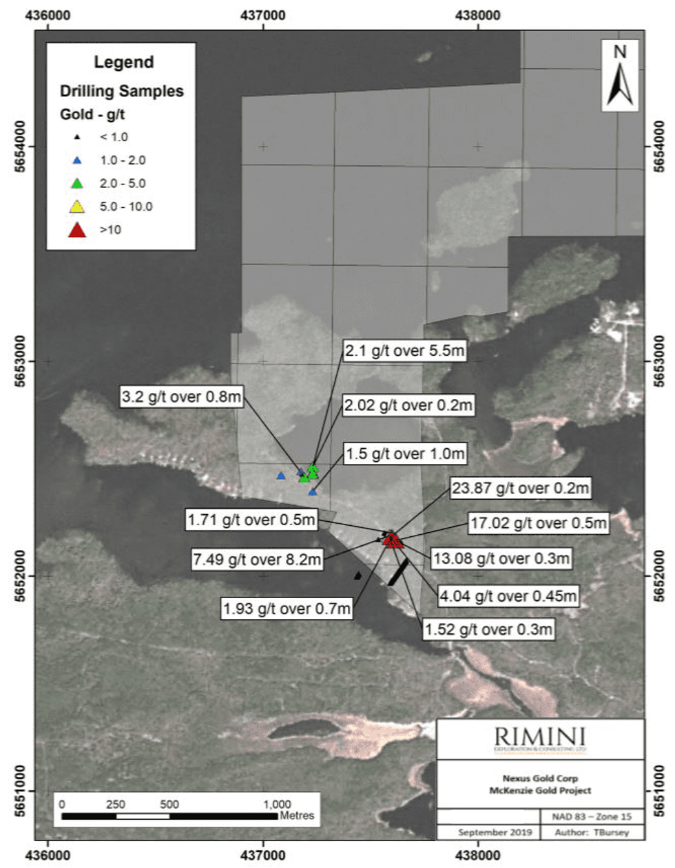 The Rimini compilation summary produced historical data the Company was previously unaware of regarding multiple historical grab samples taken on the McKenzie claim block. The Company had previously disclosed several high-grade historical grab sample results on the property, including 331.14 g/t Au, 18.02 g/t Au, 212.8 g/t Au, 313 g/t Au, 18.02 g/t Au and 9.37 g/t Au. In the summer of 2019 Nexus conducted it’s first ground reconnaissance program at McKenzie and results returned notable sample assays, including 135.4 g/t Au and 9.3 g/t Au (see Company news release dated June 25, 2019).