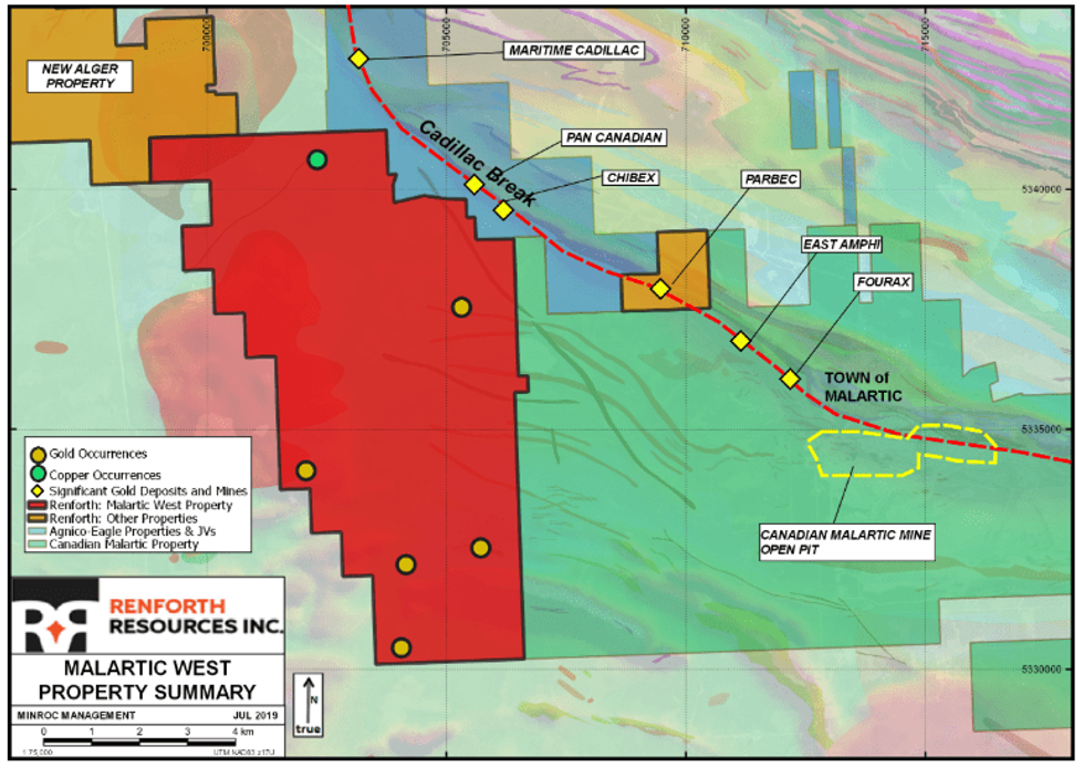 Renforth Resources Inc. (CSE:RFR, OTC Pink:RFHRF) (“Renforth” or the “Company”) is pleased to announce that our wholly owned West Malartic Property, 53 km2, gold bearing and contiguous to the Canadian Malartic Mine, is no longer under option. The option was entered into with a very specific exploration mandate focussed on the central part of the property, which was not met, however, the exploration work carried out on the property was filed for work declaration and will keep the claims in good standing for a period of time.
