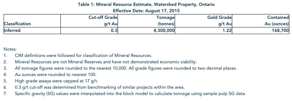 The Mineral Resource estimate incorporates assay results on mining claim 3011820 from 25 drill holes totaling approximately 9,000 metres (see Sanatana’s news releases dated February 9, 2012, March 1, 2012, April 20, 2012, and May 15, 2013) and was completed by Caracle Creek International Consulting Inc. (“Caracle Creek“). The Mineral Resource estimate, based on an open pit scenario, comprises an Inferred Resource of 4.3 million tonnes grading 1.22 grams of gold per tonne for 168,700 contained ounces, at a cut-off grade of 0.3 grams of gold per tonne (see Table 1 below).