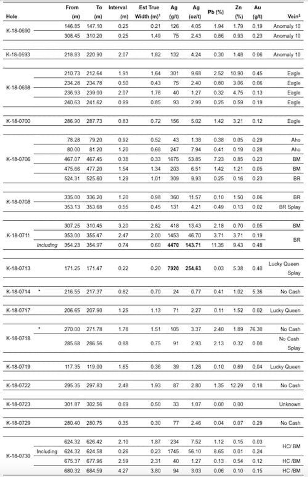 - K-18-0711 intersected the Bear Vein in the Northeast Zone grading 1,453 grams per tonne (“g/t”) (46.70 ounces per tonne (“oz/t”)) silver (“Ag”) over a true width of 2.0 m from 353.0 m including 4,470 g/t (143.71 oz/t) Ag over a true width of 0.60 m. The Bermingham Main Vein grading 418 g/t (13.43 oz/t) Ag over a true width of 2.82 m from 307.25 m was also intersected in this hole.
