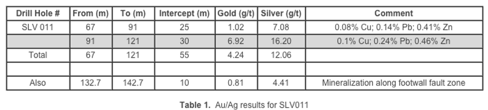 Of the five holes drilled, SLV011 (201 meters total depth – TD) was the only hole drilled into the Peshter Gossan. The results indicate continuity of gold mineralization, but also underscore the fact that the high grade gold mineralization is controlled by a number of geological and structural factors that are not yet clearly understood. The initial part of the ongoing drilling has been designed to better ascertain the parameters of the gold mineralization and, most importantly, to extend the core high grade gold mineralization. Following is a table of significant results from SLV011.