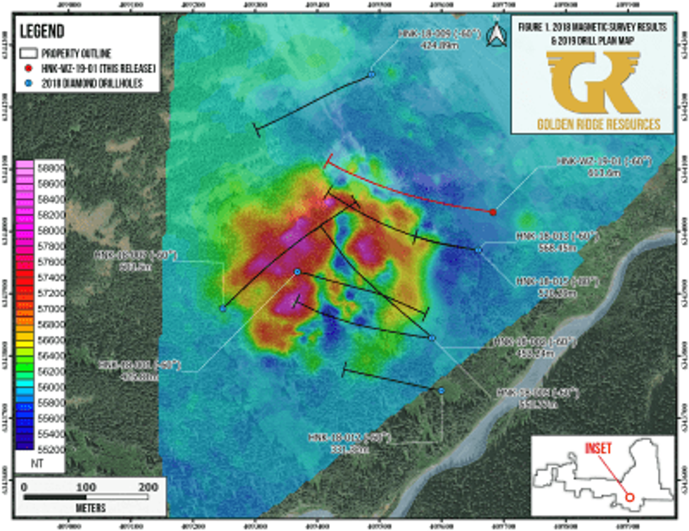 GOLDEN RIDGE RESOURCES LTD. (TSXV:GLDN, OTC:GORIF) (“Golden Ridge” or the “Company”) is pleased to report the assay results for the first 2019 hole drilled on the Company’s Hank Property (“Hank” or the “Property”), located in BC’s Golden Triangle. HNK-WZ-19-01 was a designed step out 65m north of previously announced 2018 drill hole HNK-18-013 (see NR: November 28th, 2018).