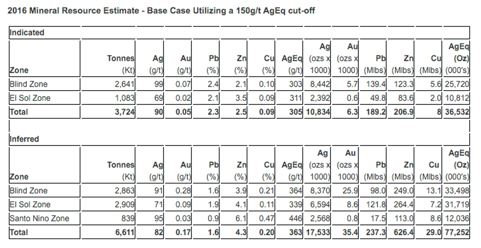- Inferred: 17.5Mozs Ag, 237Mlbs Pb and 626Mlbs Zn (77.3Mozs AgEq)