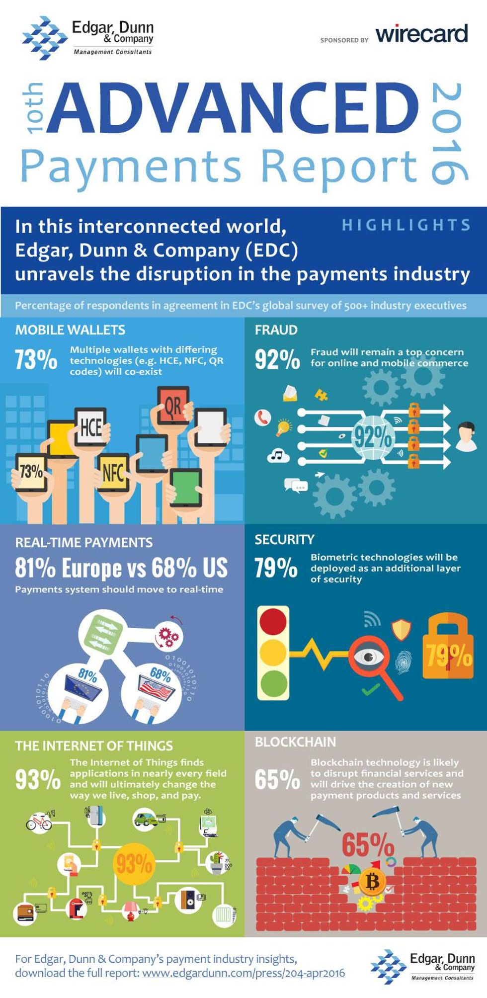 London, 4th April, 2016/PR Newswire/ – Edgar, Dunn & Company (EDC), the global strategy consultancy, released their 10th Advanced Payments Report 2016 (APR 2016), sponsored by Wirecard, the global financial services and technology company. It provides perspectives and insights from payment industry executives, analysts, and stakeholders obtained from interviews, discussions, and EDC’s annual online advanced payments survey of over 500 industry professionals.