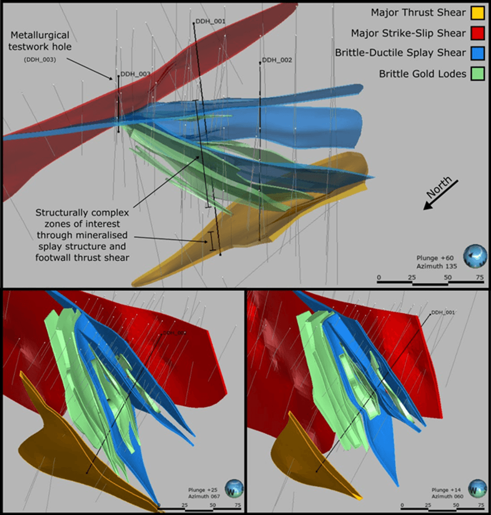 Figure 1 - Tumblegum South planned diamond Phase 3 Resource definition drilling - indicating the trace of the two proposed holes, DDH001 and 002, and their planned path, running between the two identified shear structures (Red and Yellow) and through the identified gold mineralisation lodes (Green).