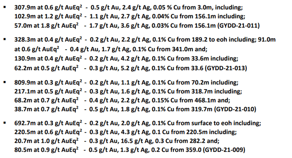 - Four holes ended in mineralisation, including GYDD-21-011 (307.9m at 0.6 g/t AuEq from surface) stopped at 310m due to drilling problems 300 metres above the main target.