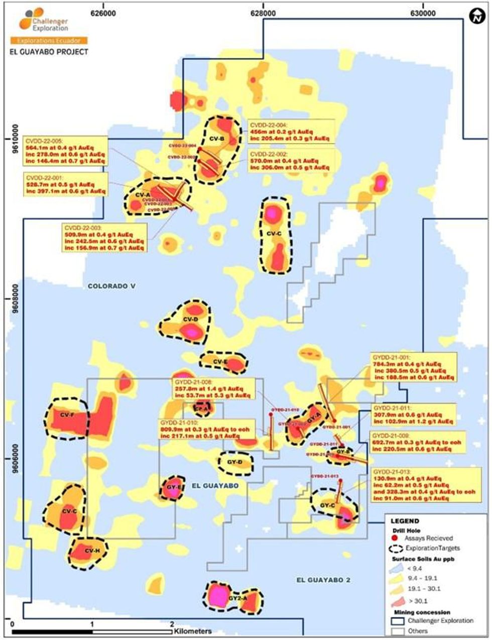 Challenger Exploration (ASX: CEL) (“CEL” the “Company”) is pleased to announce results from the next three drill holes CVDD-22-003 to CVDD-22-005 in the Colorado V concession in El Oro Province, Ecuador, where the Company is farming in to earn an initial 50% interest.