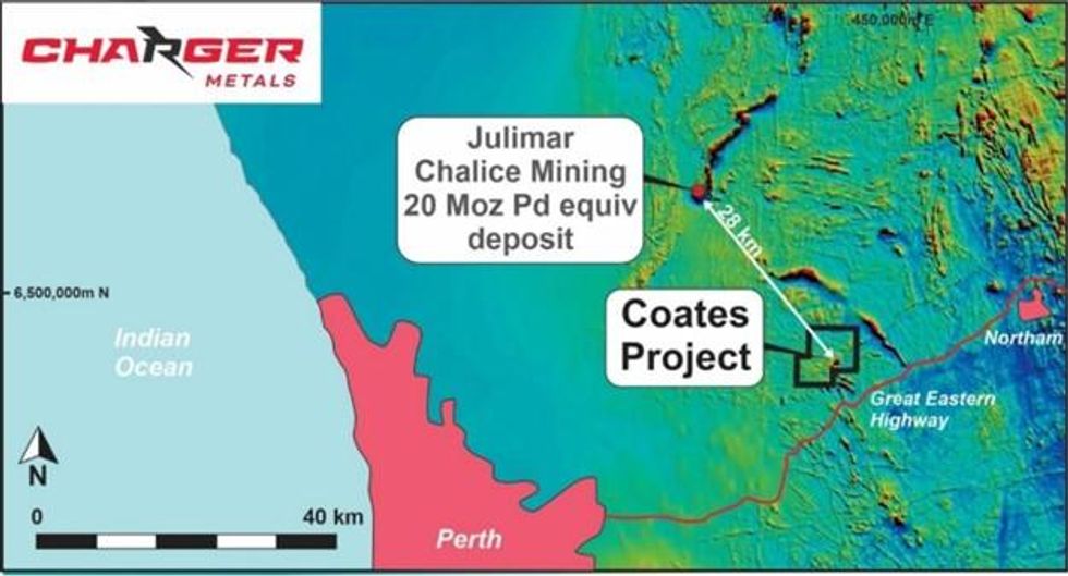 Charger Metals NL (ASX: CHR, “Charger” or the “Company”) is pleased to confirm it has completed 593m of diamond drilling at the Coates Ni-Cu-PGE 1 Project (“Coates Project”), located approximately 55km ENE of Perth, Western Australia. The Coates Project contains a mafic intrusive complex (the “Coates Mafic Intrusion”) within the Jimperding Metamorphic Belt, which also hosts the world class, 20Moz palladium equivalent Julimar - Gonneville Ni-Cu-PGE Project2 owned by Chalice Mining Ltd (ASX: CHN) and located 28km NW of the Coates Project (Figure 1, above).