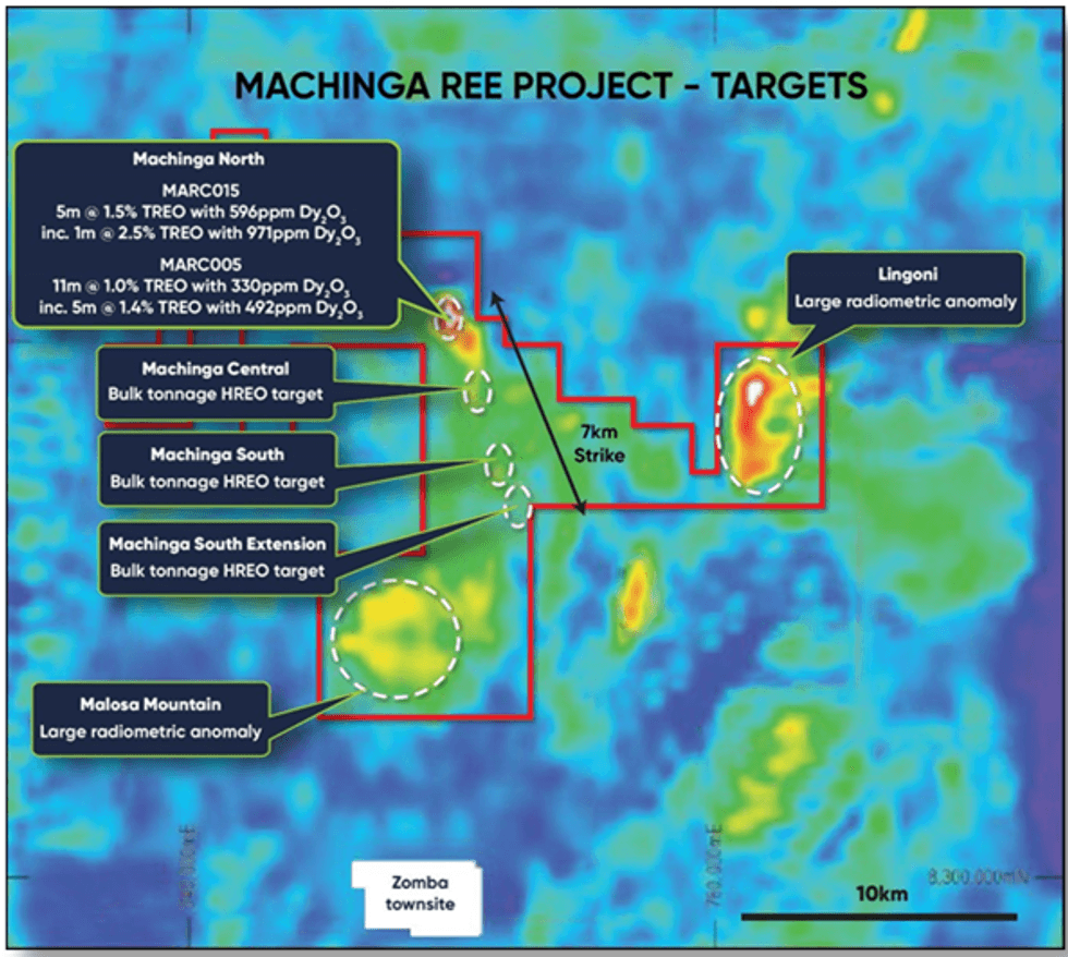 - Machinga, the Company’s flagship project, is particularly enriched with high-value heavy rare earth elements dysprosium and terbium. The project also holds significant niobium and tantalum potential as well. Machinga is only 40km east of Lindian Resources’ Kangankunde carbonatite discovery