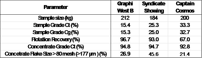Both the Graphi West (94.8% Ct) and Syndicate (94.7% Ct) samples achieved concentrate grade very close to the target. The weighted average grade for the four middle particle size classes (<300 µm) to (>44 µm) was (96.41% Ct) for Graphi West and (96.34% Ct) for Syndicate. Further work utilizing a revised flow sheet is planned for the Captain Cosmos target.