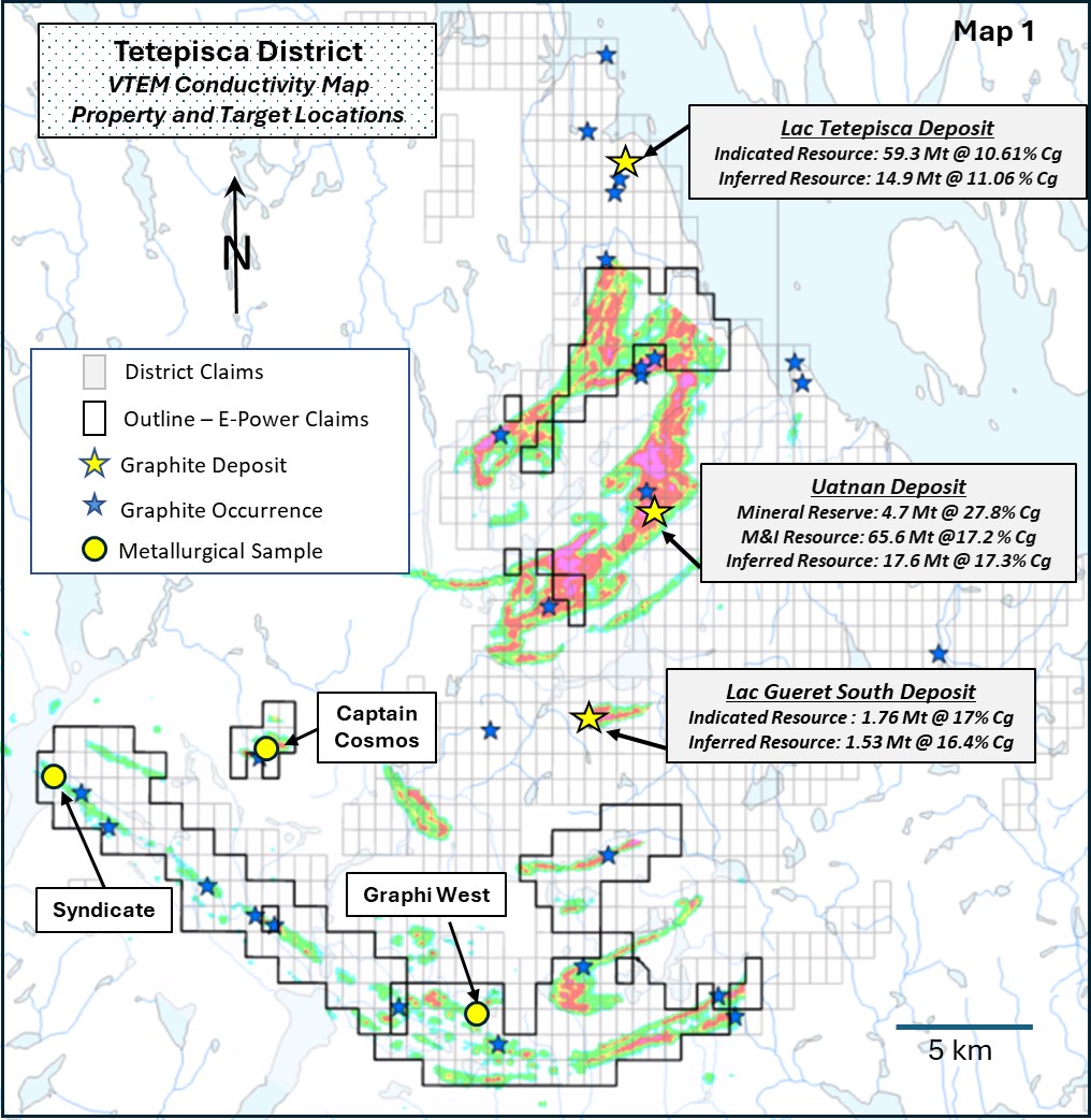 The Tetepisca Property is located in the Innu Nation of Pessamit, approximately 220 km north of the town of Baie-Comeau in the North Shore Region of Québec. The property consists of 234 claims covering an area of approximately 12,665 hectares within the emerging Tetepisca Graphite District ("TGD") (map attached.). The property is 100% owned by E-Power. Fifty-two claims, located in the southern part of the property, are subject to a 1.5% NSR held by a group of local prospectors. The TGD is an active graphite exploration and development district with delineated Measured and Indicated Resources in excess of 120 Mt at an average grade of approximately 14% Cg.