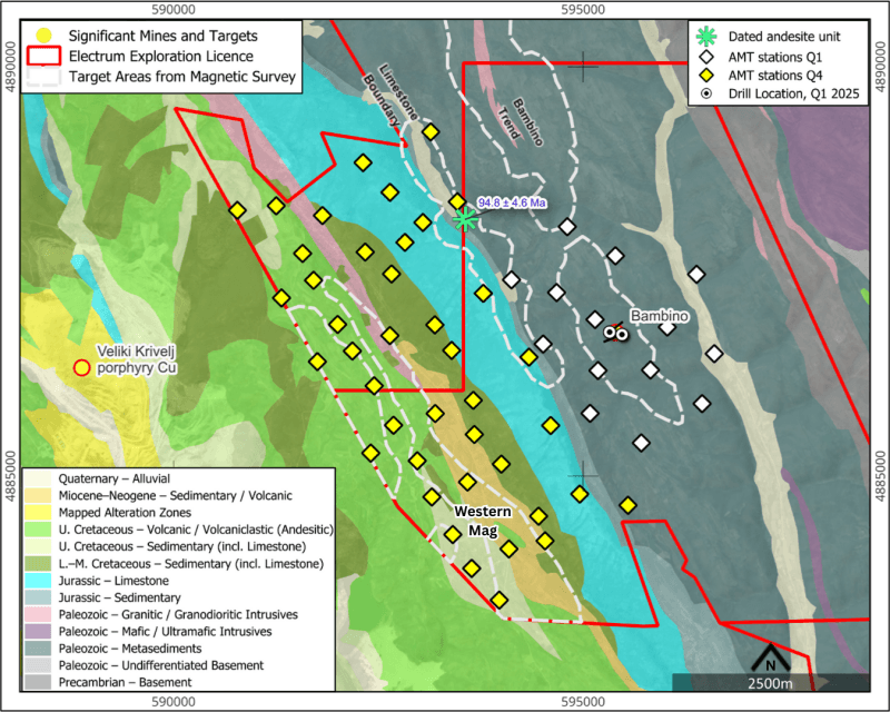 Electrum continues to advance exploration at its Timok East Project, located within the Western Tethyan Belt and adjacent to several world-class porphyry Cu-Au deposits. Exploration to date has identified multiple geophysical and geochemical anomalous zones, including the Western Mag, Bambino, and Limestone Contact targets.