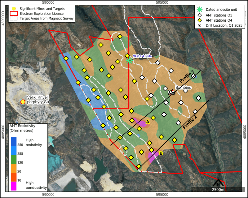 Dr Elena Clarici, CEO and President of Electrum commented: "The integration of AMT results from our previous and new surveys, andesitic units found in the Limestone Boundary magnetic anomaly, and dating studies confirming the andesites to be Late Cretaceous, has provided additional confidence that the footprint of magmatism related to the Timok Magmatic Complex extends further to the east into Timok East. The new combined AMT model using stations from both surveys has significantly extended the 3D resistivity model and highlighted two distinctive zones of high conductivity at 250–550 metres depth. Their geometry and position relative to mapped stratigraphy are highly encouraging for porphyry and related hydrothermal mineralisation. These results provide a strong technical basis for advancing these new targets into a drill-ready stage in 2026."