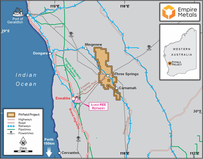 Empire Metals Ltd (AIM: EEE and OTCQX: EPMLF) is an exploration and resource development company focused on the commercialisation of the Pitfield Titanium Project, located in Western Australia. The titanium discovery at Pitfield is of unprecedented scale and hosts one of the largest and highest-grade titanium resources reported globally, with a Mineral Resource Estimate (MRE) totalling 2.2 billion tonnes grading 5.1% TiOâ‚‚ for 113 million tonnes of contained TiOâ‚‚.