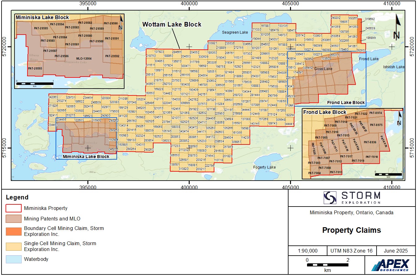 The Miminiska Gold Property is located approximately 350 kilometres (km) north of the city of Thunder Bay, 115 km east of the town of Pickle Lake, and approximately 40 km west of Fort Hope, Ontario. The property comprises 278 unpatented mining claims, 43 mining patents and 1 mining licence of occupation ("MLO"), covering a total area of 6,366.4 hectares (ha), distributed over three contiguous blocks named Miminiska Lake, Wottam Lake, and Frond Lake.