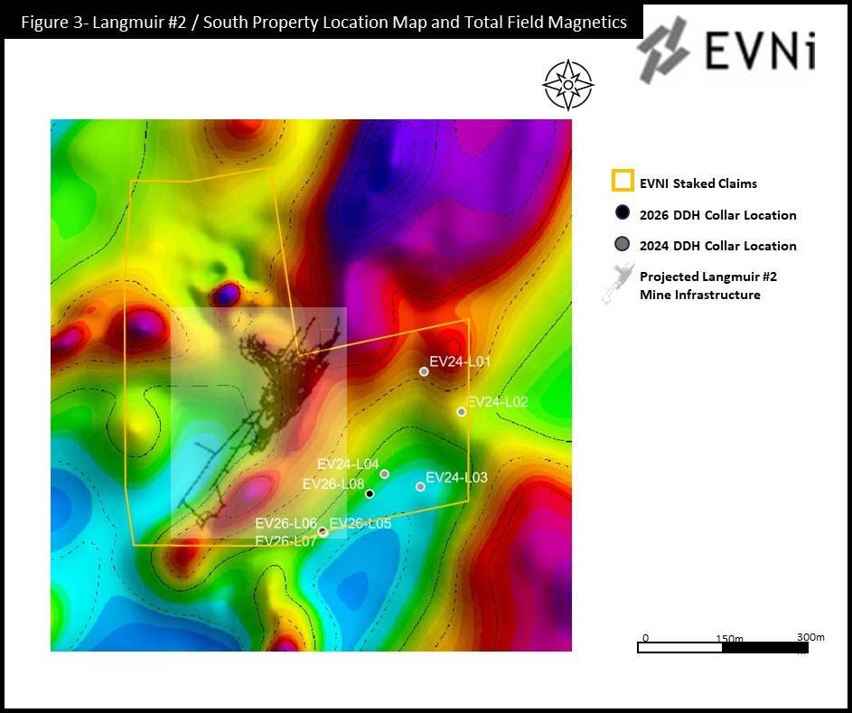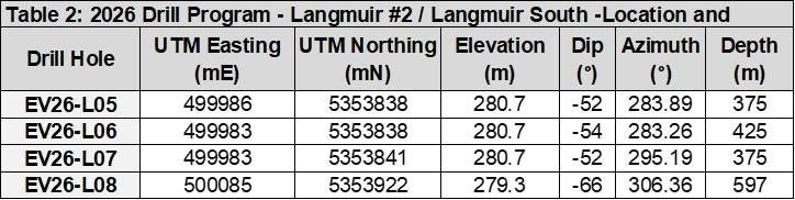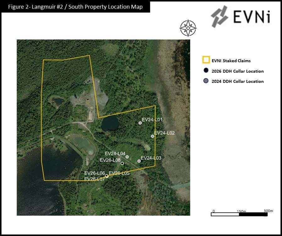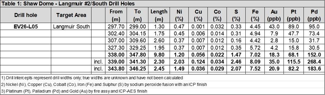 "The result of the first hole confirms that the Langmuir South Zone represents an excellent target for significant high-grade nickel sulphides," said Paul Davis, Vice President Exploration. "The Langmuir #2 and Langmuir South projects represent a unique opportunity to strengthen our already impressive stable of nickel deposits and mineralized zones. With mineralization encountered at relatively shallow vertical depth and in proximity to existing infrastructure at the historic Langmuir #2 Mine, we believe there is strong potential to rapidly advance this area. Our 2024 drill results below the Langmuir #2 Mine and hole EV26-L05 on the Langmuir South Zone demonstrates that the area is extremely fertile in regard to high-grade nickel sulphide mineralization and its capacity for meaningful near-term resource growth."