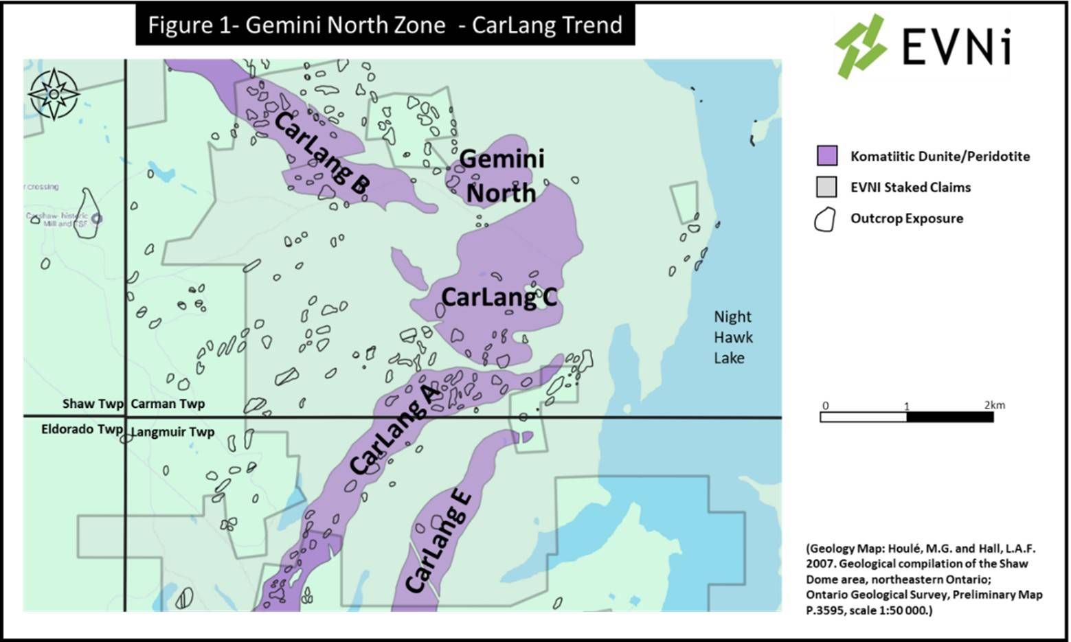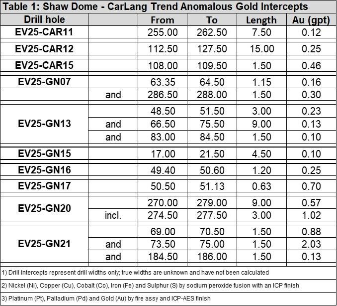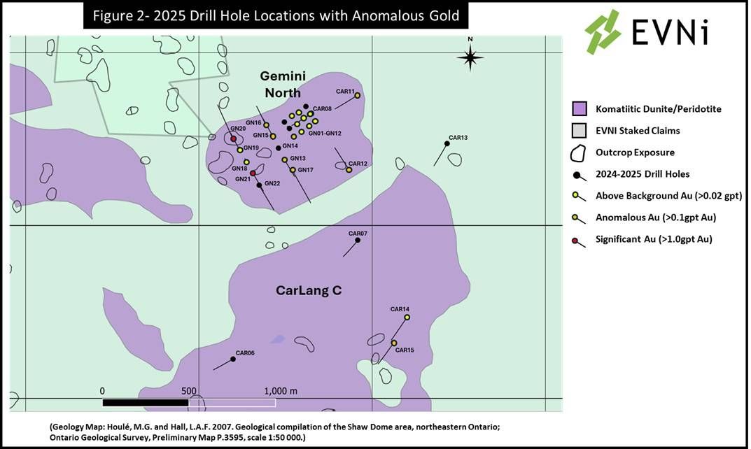 TORONTO, ON / ACCESS Newswire / March 26, 2026 / EV Nickel INC. (TSX-V:EVNI) ("EVNi" or the "Company") is pleased to announce the discovery of anomalous gold mineralization associated with the Gemini North Nickel Zone at its Shaw Dome Project, Timmins, Ontario. Results from the Company's 2025 diamond drilling program have identified gold mineralization above background level concentrations of greater than 0.02 grams per tonne ("gpt") Au over a minimum drill intersection of 1.5 metres in 21 of 28 drill holes completed to date (see press releases dated March 19, 2025 and January 20, 2026).
