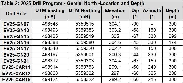 Diamond drill holes completed prior to January 2025 were not systematically analyzed for gold, and as a result, no comparable gold data are currently available for these earlier holes including EV24-CAR07 and EV24-CAR06.